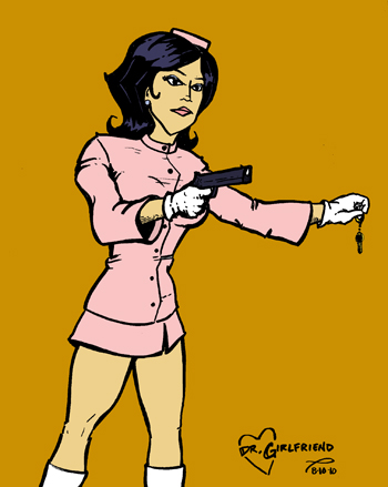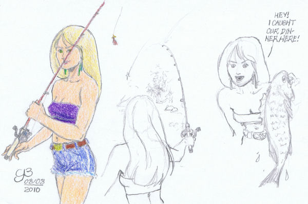 Further experimentation with the colored pencils.  Also, a little attempt at tackling drawing a pretty girl in a tube top going fishing.  Looking at this now, I wonder if having a few good reference photos would be a boon to me?