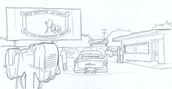 Bill, Drive-in theaters were one piece of Americana that I sorely miss. I saw my last one outside of Wilmington, DE as a wee lad -- they were showing Gumball Rally (the stuntman on the motorcycle cracked me up). You couldn't show even one third of todays films outside, for fear of getting the local prudes and anti-violence cops up in arms. My sketch for the day...