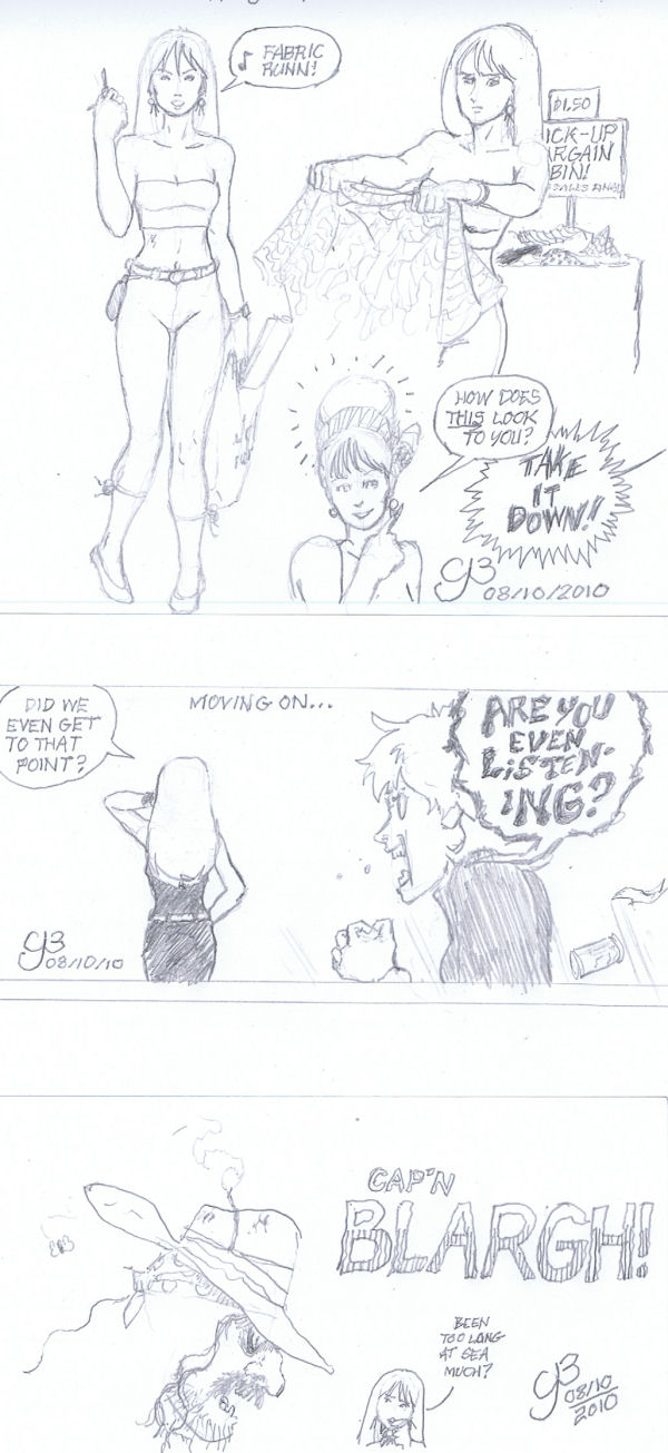 It's a collage of that girl I've been posting, along with a couple of other characters. The first one is a teammate and rival (more like the Green Lantern to her Green Arrow, or the Dr. Charles Winchester the 3rd to her Benjamin "Hawkeye" Pierce). The second one, at the bottom -- well, I felt like spoofing that craze about pirates. "Cap'n BLARRRRGGGGGGHHH!" "Been at sea too long much?"