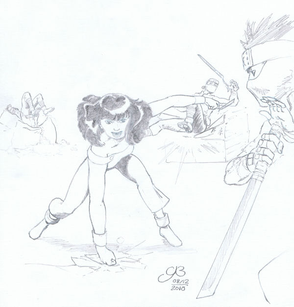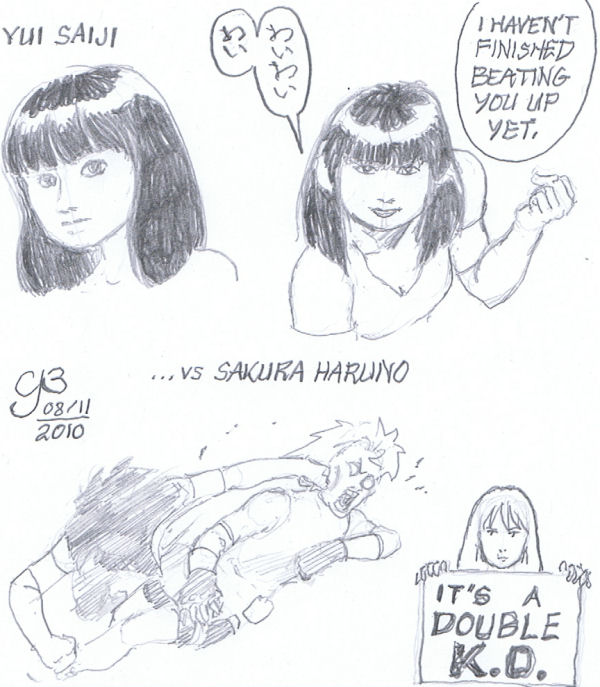 Giving Jenny a rest to showcase one of her friends. Yui Saiji is codenamed "Kid Fury", an apt name given her abilities (super-strength, endurance and a healing factor akin to Wolverine's) and wild peronality. The character Sakura Haruno she's trading blows with at the bottom isn't one of mine -- she comes from a Japanese comic titled Naruto, created by Masashi Kishimoto and serialized in the weekly Shonen Jump anthologies. I'm thinking of giving Yui a slight redesign. Love how some Asian girls cut their hair in a bowl shape (must be an advantage if you have thick, straight hair). Giving her forelocks more length so that her eyes become somewhat hooded, adding a bit of "tough gal" effect to her, etc.