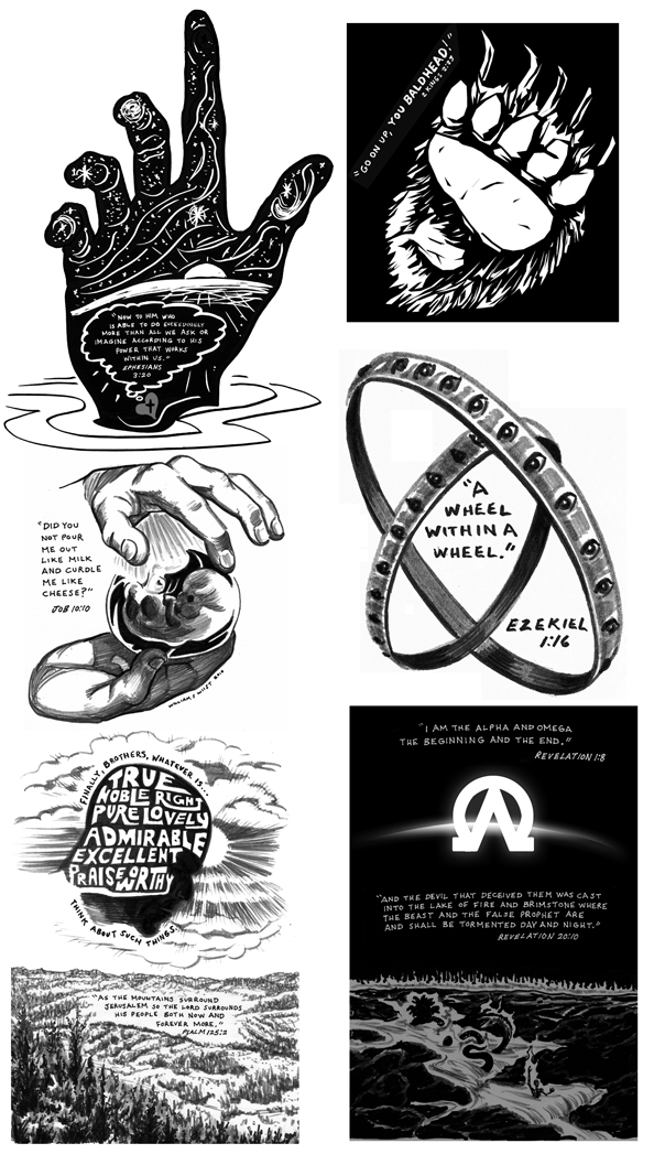Last week I decided it would be interesting to begin sketching Bible verses. I began by taking suggestions from FB friends and wound up with plenty. I'm doing one verse a night, and then posting it shortly after to FB. At the end of the week I post them on my blog. It's a challenging exercise that I'm enjoying doing. Here's a peek at the first week's verses: